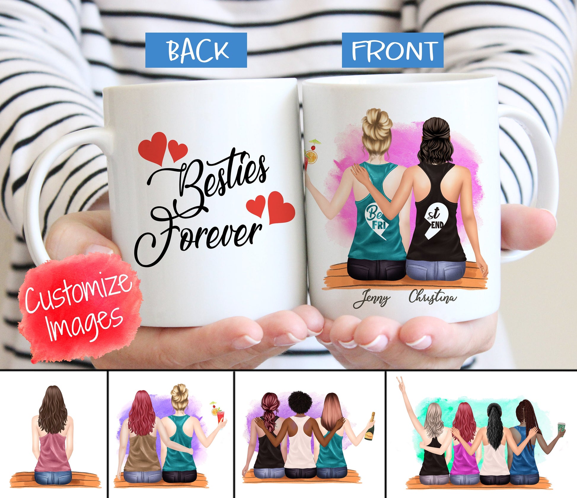 An ultimate personalized gift item for you and your best friends. Personalize to the very last detail. Perfect as gift and friendship keepsakes. This is a ceramic mug in 11 oz or 15 oz. Mugs are also available in white, pink trim, green trim, and black trim.